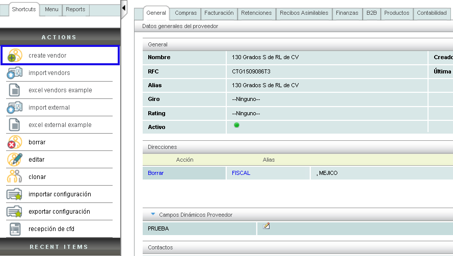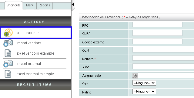 To perform this action, click on the option “Create Vendor” located in the menu “Actions”.